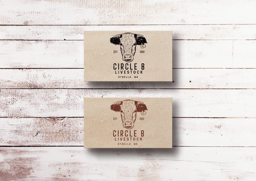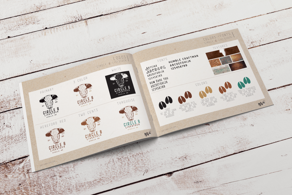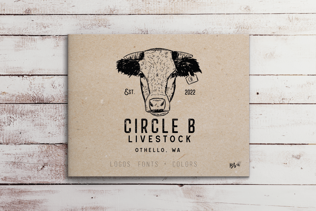 While I’m generally reluctant to pick up my pencil, I wanted Justin & Bailey to have a cow unlike any other for their new business venture. Frank quickly became the face of the business at Circle B Livestock. I finished off the look with some textured, rustic fonts & color palette to match Frank’s coloring.